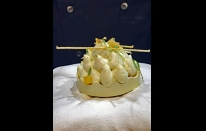 El tinerfeño presentó una elaboración con una galleta deconstruida crujiente hecha con coco, almendra y aromatizada con lima; un cremoso de fruta de la pasión, coco, piña y plátano; una compota de piña de Buenavista, salpicada con vainilla y una ganache aromatizada con cilantro y yuzu.