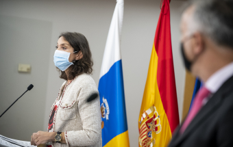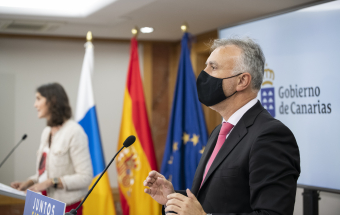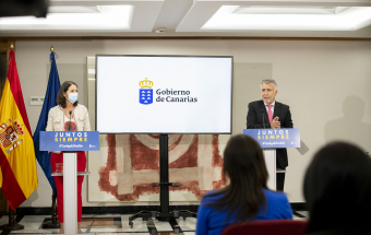 El presidente de Canarias, Ángel Víctor Torres, junto a la ministra de Industria, Comercio y Turismo, Reyes Maroto, ofrecieron hoy una rueda de prensa tras conocerse que España exigirá a los viajeros internacionales procedentes de países de riesgo una PCR negativa en las 72 horas previas a la llegada a España para poder entrar en el país.