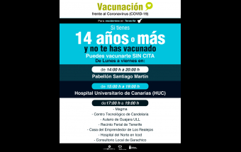 La Consejería de Sanidad del Gobierno de Canarias rebaja a 14 años la edad con la que los residentes en Gran Canaria y Tenerife podrán vacunarse contra la COVID-19 sin cita previa mañana miércoles en varios puntos de vacunación masiva de ambas islas. Algunos de estos espacios amplían su horario para este grupo de población para impulsar la vacunación a los más jóvenes.