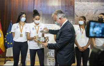 El homenaje brindado por el Gobierno de Canarias a las deportistas e integrantes del cuerpo técnico del primer equipo femenino del CV Haris contó con la asistencia del presidente de ese club tinerfeño, David Martín, y de representantes de los principales patrocinadores del equipo, las marcas Sanaya y Libby’s.