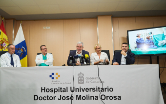 El presidente de Canarias, Fernando Clavijo, intervino en la rueda de prensa de presentación del primer robot Quirúrgico (Da Vinci) en el Hospital Universitario Dr. José Molina Orosa, en Arrecife, que permitirá a los pacientes acceder a intervenciones menos invasivas, con una recuperación más rápida y con mejores resultados.