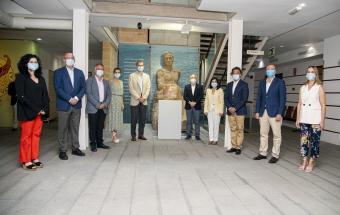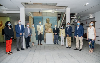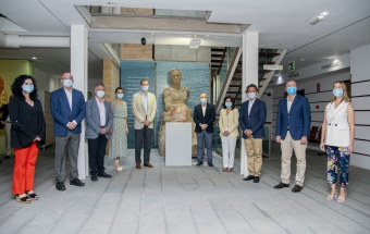 Ya en el patio, posaron junto a la obra del escultor Victorio Macho, que llamó la atención de la Reina al cerciorarse de que es igual que la del Retiro, donde hay una escultura anterior que le realizó Macho a su amigo, tras lo cual recibieron explicaciones de los libros expuestos hasta acceder al segundo patio, por donde ascendieron a las habitaciones que contienen la esencia del escritor.