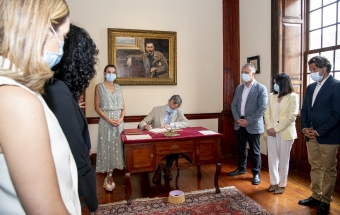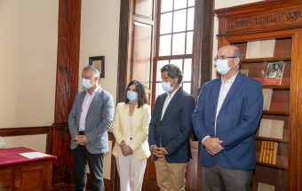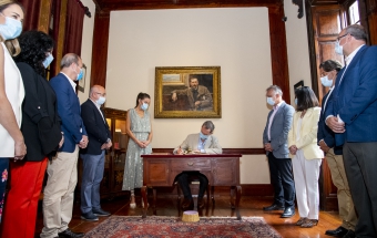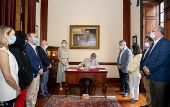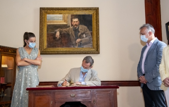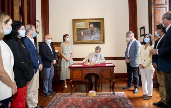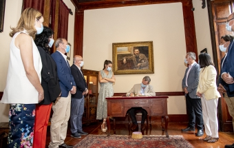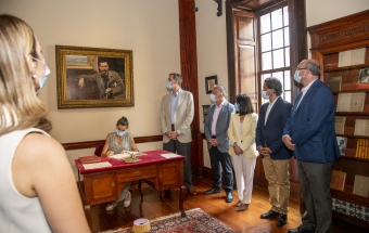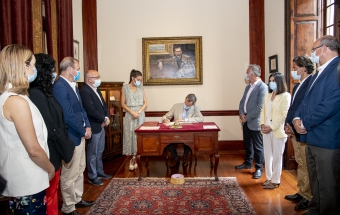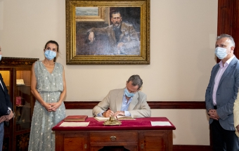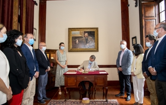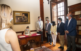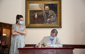 Junto a la comitiva que los arropó, formada también por el delegado del Gobierno, Anselmo Pestana, y el presidente del Parlamento, Gustavo Matos, accedieron finalmente a la sala Sorolla, presidida por el inolvidable retrato de Pérez Galdós que durante años acompañó a la población española desde sus billetes de mil pesetas, y ante el que se sitúa el escritorio en el que el Rey escribió sin prisas su texto para firmarlo y ceder el asiento a la Reina, quien también lo rubricó: