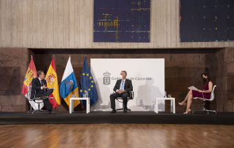 El presidente de Canarias, Ángel Víctor Torres, y su homólogo de Castilla-La Mancha, Emiliano García-Page, analizaron hoy la crisis sanitaria, económica y social desatada por la pandemia de la COVID-19 en sus comunidades, España y el resto del planeta desde marzo de 2020 y las respuestas que han dado desde sus respectivos gobiernos autonómicos. Lo hicieron en el marco de la segunda edición de los “Diálogos en Presidencia”, iniciativa organizada por el Ejecutivo canario con el fin de profundizar en cuestiones de actualidad y en las respuestas que se dan desde las administraciones públicas.
