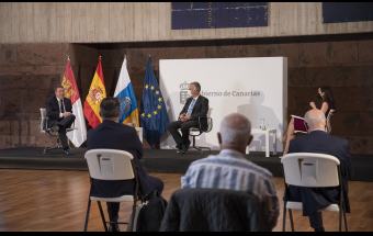 El debate tuvo lugar en la sede de Presidencia de Santa Cruz de Tenerife bajo el título de “Dos presidentes, dos respuestas ante la crisis” y fue moderado por la periodista de Radio Televisión Canaria (RTVC) Marta Rodríguez, especializada en información política y del Parlamento isleño. Ante la presencia de los dos consejeros de Sanidad de ambas comunidades, Blas Trujillo y Jesús Fernández, y de representantes empresariales, sindicales y de otros ámbitos de la sociedad canaria, los presidentes analizaron, en el primer bloque del diálogo, su reacción ante el Estado de Alarma decretado por el Gobierno de España el 14 de marzo de 2020. También las medidas que han aplicado en este año para reforzar el sistema sanitario, desarrollar la vacunación desde el 27 de diciembre y controlar la pandemia con el menor impacto posible en la economía y garantizando la máxima movilidad, llegada de suministros y desarrollo del curso escolar que permitieran las circunstancias, con gran éxito en cuestiones como la enseñanza presencial y la cobertura de los servicios y abastecimientos básicos.