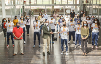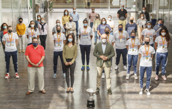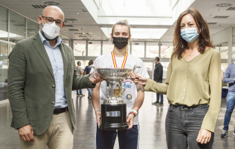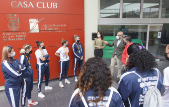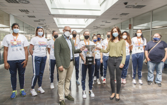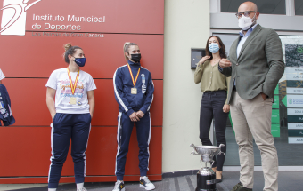 El concejal de Deportes del Ayuntamiento de Las Palmas de Gran Canaria y los trabajadores del Instituto Municipal de Deportes felicitaron a las flamantes campeonas de la Liga Iberdrola en un acto donde la copa de campeonas fue protagonista