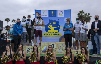 El padrino del torneo, Sergio Camarero, la gerente del IMD, Leticia López y el presidente de la Federación Canaria de Voleibol, Roberto Melián, acudieron a la cita con la fiesta del voley playa en Canarias.