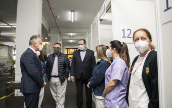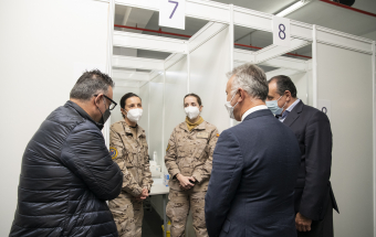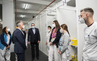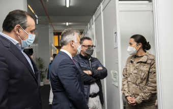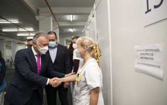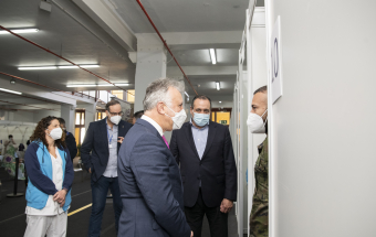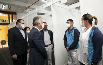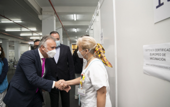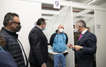 El presidente de Canarias, Ángel Víctor Torres, junto al consejero de Sanidad, Blas Trujillo, y el director del Servicio Canario de Salud, Conrado Domínguez, ha visitado este lunes el punto de vacunación contra la COVID-19 en el Instituto Ferial de Canarias (INFECAR), cuando se cumplen dos años de la detección del primer caso de coronavirus de España, que se produjo en La Gomera. Durante este período Canarias se ha mantenido como la comunidad autónoma con menos contagios de todo el país.
