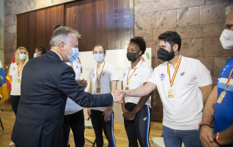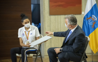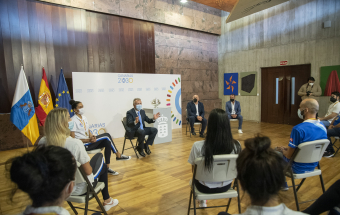 El homenaje brindado por el Gobierno de Canarias a las deportistas e integrantes del cuerpo técnico del primer equipo femenino del CV Haris contó con la asistencia del presidente de ese club tinerfeño, David Martín, y de representantes de los principales patrocinadores del equipo, las marcas Sanaya y Libby’s.