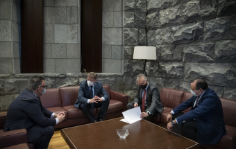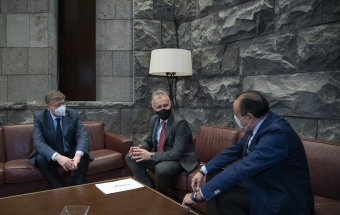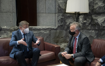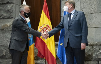 El presidente de Canarias, Ángel Víctor Torres, recibió hoy en la sede de Presidencia del Gobierno en Santa Cruz de Tenerife a su homólogo en la Generalitat Valenciana, Ximo Puig i Ferrer. A continuación, y tras un saludo y una foto institucional en la que también participó el consejero de Sanidad del Gobierno de Canarias, Blas Trujillo, los dos presidentes procedieron a firmar un convenio de colaboración en el ámbito sanitario antes de ofrecer una rueda de prensa.