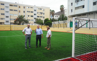 El alcalde de Las Palmas de Gran Canaria, Augusto Hidalgo, y el concejal de Deportes, Aridany Romero, supervisaron hoy las obras de mejora llevadas a cabo por el Instituto Municipal de Deportes en la pista deportiva de Las Tenerías, que ha experimentado una remodelación integral contando con una inversión de 65.641 euros.
