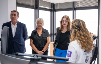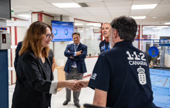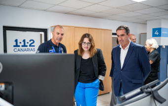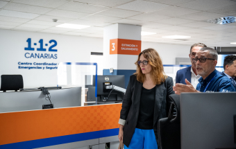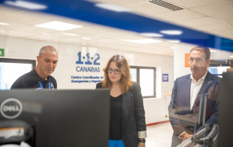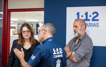 La consejera estuvo acompañada en la visita por la directora del Instituto Canario de Igualdad (ICI), Ana Brito, el director del 1-1-2 Canarias, Moisés Sánchez, el gerente de la empresa pública GSC, Juan Ignacio Pérez-Nievas y el responsable de la sala en Las Palmas de Gran Canaria, Alexis Moreno.