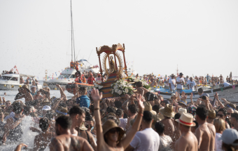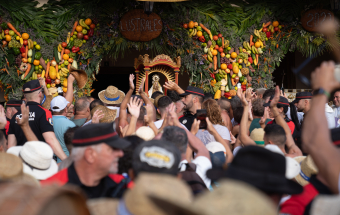 Y desde el momento que la Imagen llegó a la orilla, la playa se convirtió en una gran fiesta, con el sonido incomparable del tambor y el repique de las chácaras, acompañando al pie de romance dedicado a la Bajada, con el silbo gomero atravesando el aire, al tiempo que decenas de palomas sobrevolaban el cielo de San Sebastián, todo ello mezclándose con los gritos exultantes de “La Virgen ya está aquí”.