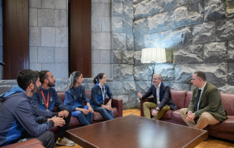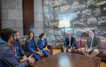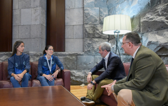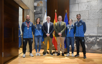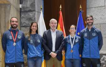El presidente de Canarias, Fernando Clavijo, recibi hoy, junto al consejero de Educacin, Formacin Profesional, Actividad Fsica y Deportes, Poli Surez, a los medallistas canarios en el campeonato del Mundo de Beach Ultimate. Concretamente, a Patricia Gonzlez, Pablo Dorta, Jos Gabaldoni, medallas de plata en la categora mixta; Miguel Jimnez, medalla de plata en la categora masculina y Cristina Gonzlez, medalla de bronce en la categora femenina.