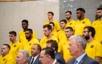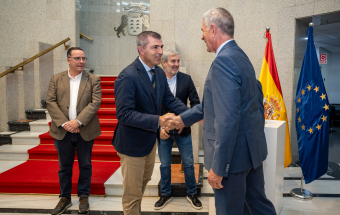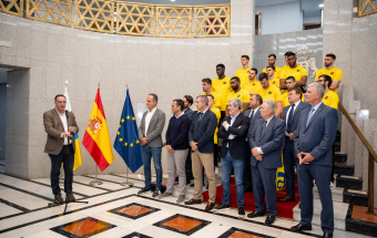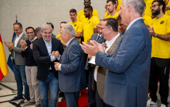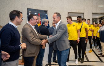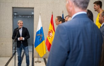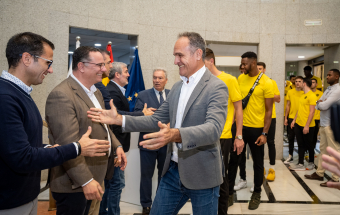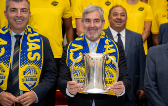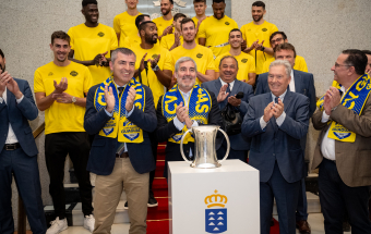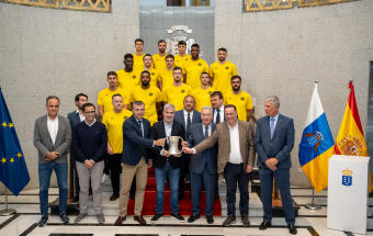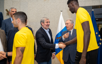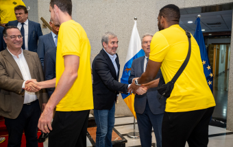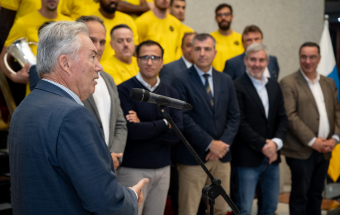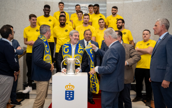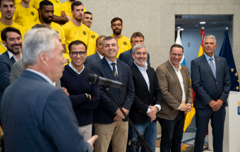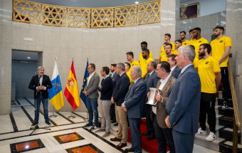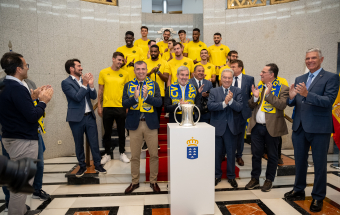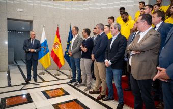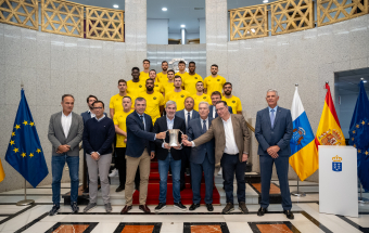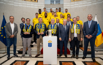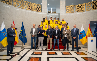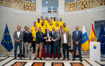 El presidente del Gobierno, Fernando Clavijo, acompañado del vicepresidente, Manuel Domínguez, el consejero de Deportes, Poli Suárez, y el viceconsejero del área, Ángel Sabroso, recibió hoy en la sede de Presidencia del Gobierno de Canarias al CV Guaguas después de que el equipo que preside Juan Ruiz y entrena Sergio Miguel Camarero lograra ayer en Madrid la Copa del Rey de voleibol tras superar por un contundente 3-0 al Unicaja de Almería.