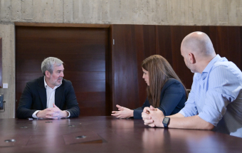 El presidente de Canarias, Fernando Clavijo, mantuvo hoy un encuentro con la profesora de la Universidad de La Laguna (ULL), Paula Hernández, y el maestro del Centro de Educación Infantil y Primaria La Vega, Ricardo Acosta, reconocidos como mejores docentes de España en los Premios Educa Abanca 2025.