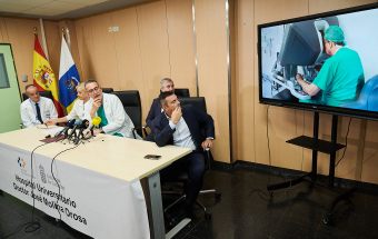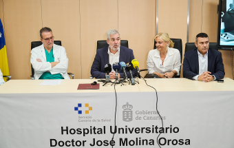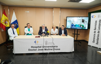 El presidente de Canarias, Fernando Clavijo, intervino en la rueda de prensa de presentación del primer robot Quirúrgico (Da Vinci) en el Hospital Universitario Dr. José Molina Orosa, en Arrecife, que permitirá a los pacientes acceder a intervenciones menos invasivas, con una recuperación más rápida y con mejores resultados.