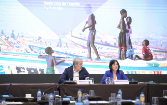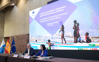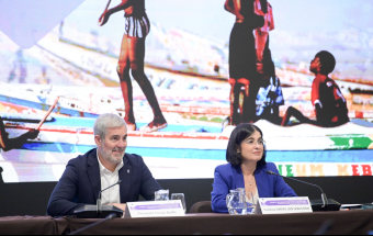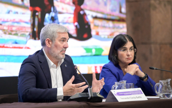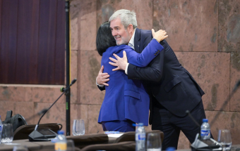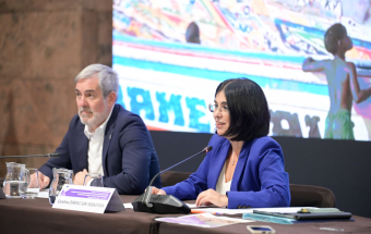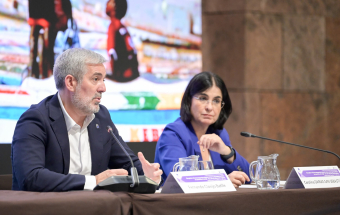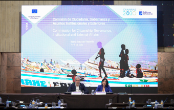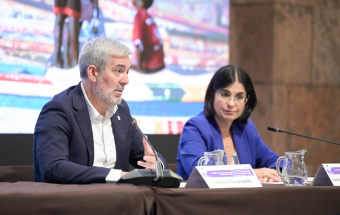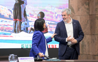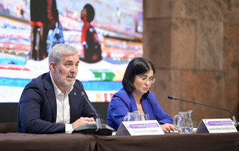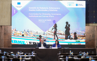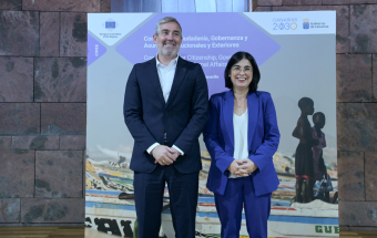 El presidente de Canarias, Fernando Clavijo, y la vicepresidenta primera de la Comisión de Ciudadanía, Gobernanza y Asuntos Institucionales y Exteriores del Comité de las Regiones, (CIVEX) Carolina Darias, ofrecieron hoy una rueda de prensa con motivo de la conferencia que celebra la comisión, este martes 8 de julio, sobre El papel de las ciudades y las regiones en la acogida de menores migrantes no acompañados y oportunidades en los países de origen